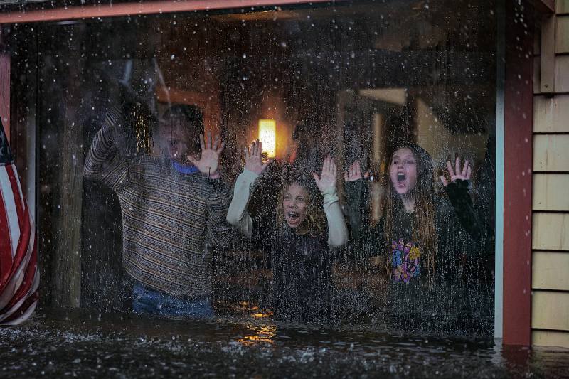 ตัวหนังคนที่สู้เอาตัวรอดจากฉลามจริงๆ คือสองกลุ่มที่เหลือ ซึ่งหนังก็โฟกัสว่าพวกเขาทั้งสองฝ่ายมีสถานการณ์ดราม่าชีวิตที่ต่างกัน ฝ่ายเด็กสาวมีสาวท้องแก่ใกล้คลอดที่เธอต้องเอาชนะโรคกลัวออกจากบ้านของตัวเองไปช่วยเธอให้ได้ และยังต้องพาเธอหนีออกจากบ้านที่น้ำท่วมสูงขึ้นเรื่อยๆ จนมิดชั้น 2 ซึ่งเนื้อเรื่องส่วนนี้คือเหตุการณ์นอกบ้านที่ต้องเจอกับฝูงฉลามวนเวียนภายนอก ส่วนเด็กสามคนนั้นต้องเจอกับความสะเพร่าของพ่อแม่บุญธรรมที่ไม่คิดจะอพยพหนีไปเพราะเชื่อว่าตัวเองคุมสถานการณ์ได้ แต่แล้วทั้งคู่ก็กลายเป็นเหยื่อฉลามและปล่อยให้เด็กทั้งสามคนต้องหาวิธีเอาชีวิตรอดในบ้านที่มีฉลามว่ายเข้ามาให้ได้